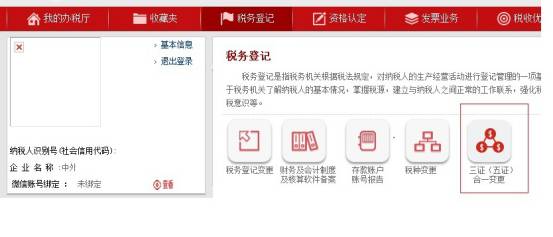 登錄網(wǎng)上辦稅服務(wù)廳選中稅務(wù)登記模塊點(diǎn)擊“三證(五證)合一變更”
