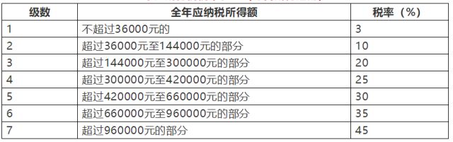 (注1:本表所稱全年應(yīng)納稅所得額是指依照本法第六條的規(guī)定,居民個人取得綜合所得以每一納稅年度收入額減除費用六萬元以及專項扣除、專項附加扣除和依法確定的其他扣除后的余額。注2:非居民個人取得綜合所得依照本表按月?lián)Q算后計算應(yīng)納稅額。)